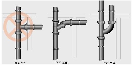 在彎頭和三通處未采用順流配件,增加了水流阻力?;蛘吲潘畽M管的兩排水口水相向流至兩口間的三通處匯集,從三通的側(cè)端承口接管排走,其弊端不僅是水流不順,而且該管段坡度不合理,極易堵塞。宜將此種“頂頭T”的做法改為彎頭加順水三通(是否改為Y三通或TY三通)相錯開,避免不同方向的排水在平面上正交相遇。