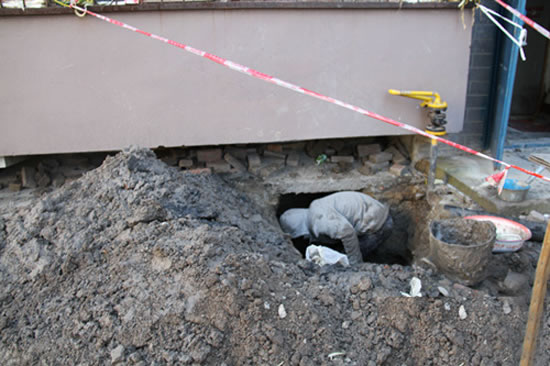 維修工人正在深坑內(nèi)更換新的鑄鐵排水管