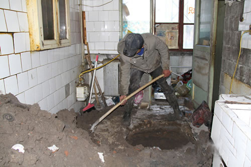 維修工作已經(jīng)完成,工作人員正在為一樓住戶家中所挖深坑進(jìn)行填補(bǔ)恢復(fù)。